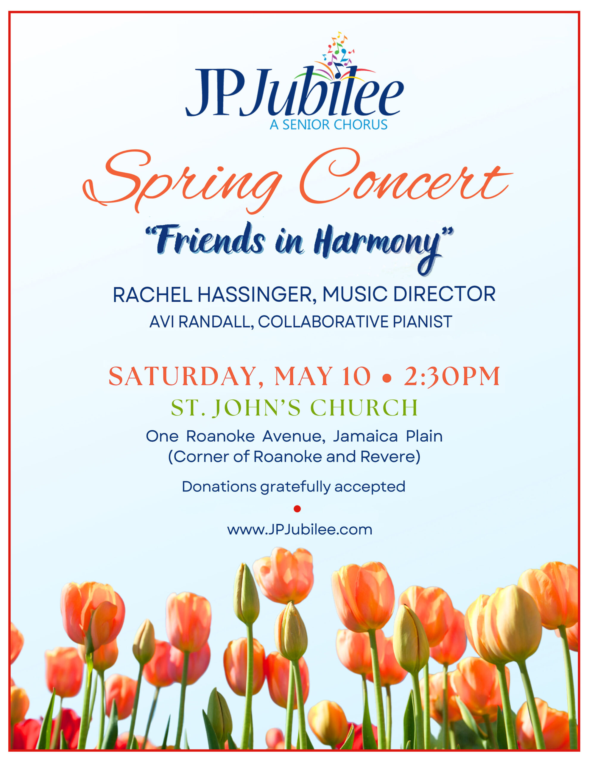 JP Jubilee was founded in 2013 by Liz Anker, who led us in song until her retirement in 2021. Currently under the leadership of Rachel Hassinger, Music Director, along with Avi Randall, Collaborative Pianist, we meet at the Jamaica Plain branch of the Boston Public Library on Friday mornings for fall and spring semesters and hold free concerts each year for friends, family, and members of the community in December and May.